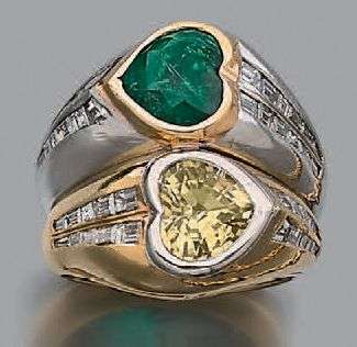 * Bague «toi et moi» en or jaune 18k (750) et platine (950) sertie d'une émeraude et d'un saphir jaune en coeur épaulés de lignes de diamants baguettes. Signée.