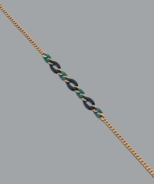 Collier "gourmette" en or jaune 18K (750) formé au centre d'une alternance d'anneaux en onyx et chrysoprase entrelacés d'anneaux en or jaune sertis de diamants. Signé. Vers 1970.