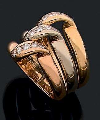 Bague trois ors composée de trois anneaux rehaussés d'un chevron serti de diamants. Signée et numérotée.