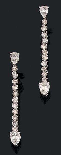 Paire de grands pendants d'oreilles en or gris 18k (750) composés d'une chute de diamants et de deux diamants en poire, l'un plus important en pampille.