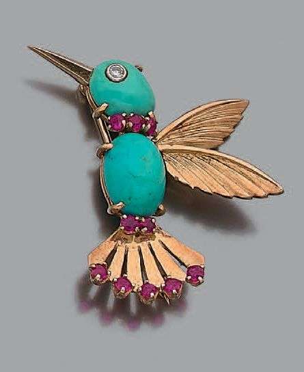 Broche «colibri» en or jaune 14K (585) sertie de deux cabochons de turquoise rehaussés de rubis et d'un brillant pour les yeux.