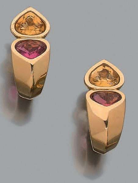 Paire de clips d'oreilles en or jaune 18k (750) ornés de citrines et tourmalines en coeur. Signées et numérotées.