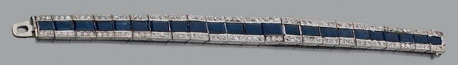 Bracelet articulé en platine (950) serti d'une ligne de saphirs calibrés en chute épaulée de deux lignes de diamants de taille ancienne.