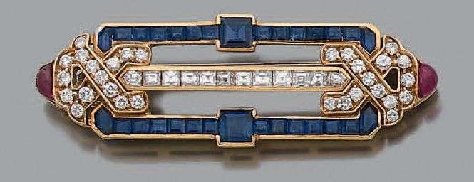 Broche de forme géométrique en or jaune 18K (750) sertie de diamants et saphirs calibrés et rubis cabochons.