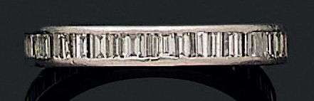 Alliance en platine (950) sertie d'une ligne de diamants baguettes.
