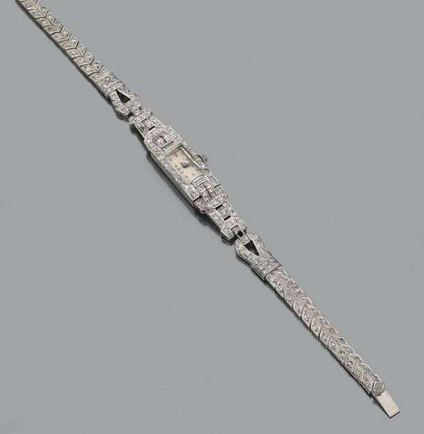 Montre de dame en platine (950), cadran, attaches et bracelet sertis de di