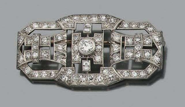 Broche en platine (950) de forme géométrique sertie d'un diamant central de taille ancienne plus important. Travail français. Vers 1930