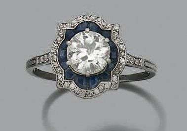 Bague en platine (950) sertie d'un diamant central demi-taille dans un double entourage de saphirs calibrés et diamants de taille ancienne. Travail français . Vers 1910