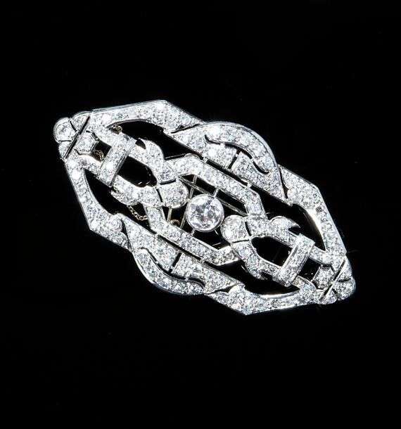 Grande broche en platine (950) de forme hexagonale à décor ajouré sertie de diamants de taille huit huit et d'un diamant central de taille ancienne. Travail français. Vers 1935