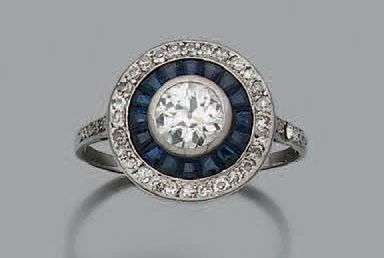 Bague en platine (950) sertie d'un diamant central de taille ancienne dans un double entourage rond de saphirs calibrés et diamants. Vers 1920.