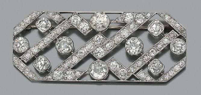 Broche en platine (950) de forme rectangulaire à pans coupés sertie de diamants de taille ancienne.