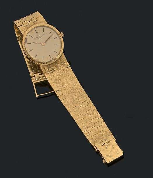 Montre bracelet de dame en or jaune 18k (750), cadran rond fond coré, index et aiguilles batons.Bracelet souple martelé. Mouvement mécanique. Bracelet et cadran signés.