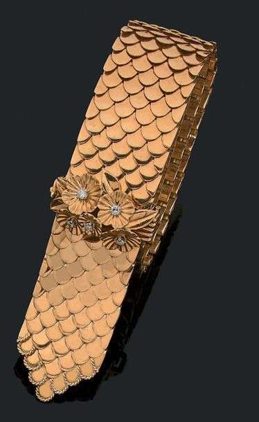 Bracelet "ceinture" en or jaune 18k (750) à décor d'écailles et orné sur la boucle de fleurs serties de diamants. Travail français. Vers 1940.