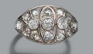 Bague en or gris 18k (750) et platine (950) sertie de diamants de taille ancienne et taillés en roses.