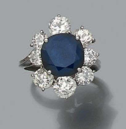 Bague "marguerite" en or gris 18k (750) sertie d'un saphir rond dans un bel entourage de diamants de taille ancienne et moderne.