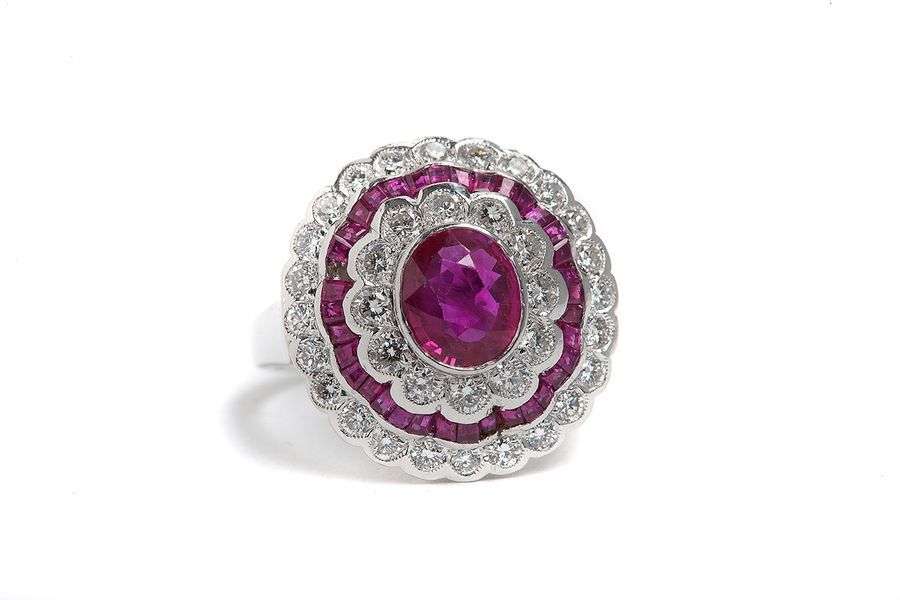 Bague en or gris 18k (750) sertie d'un rubis central dans un triple entourage de rubis calibrés et diamants.