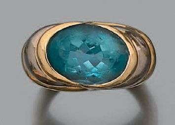 Bague en or jaune et gris 18k (750) sertie d'une aigue-marine ovale. Signée