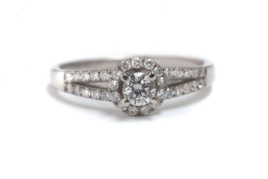 Bague en or gris 18k (750) sertie d'un diamant central dans un entourage de diamants et épaulé de 4 lignes de diamants