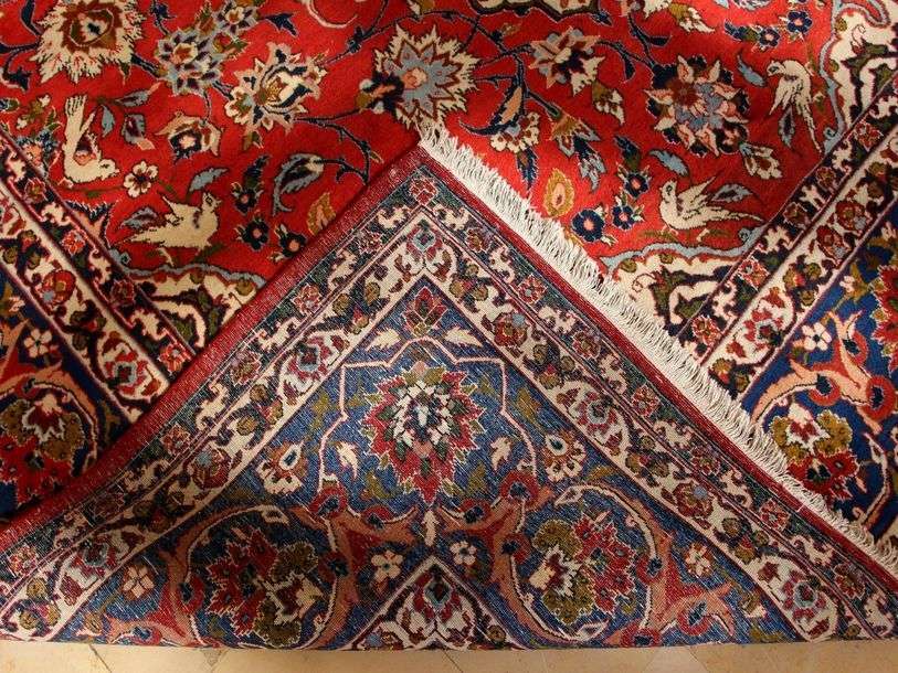 Champ rubis à rinceaux et guirlandes de fleurs encadrant une rosace centrale florale étoilée ivoire
