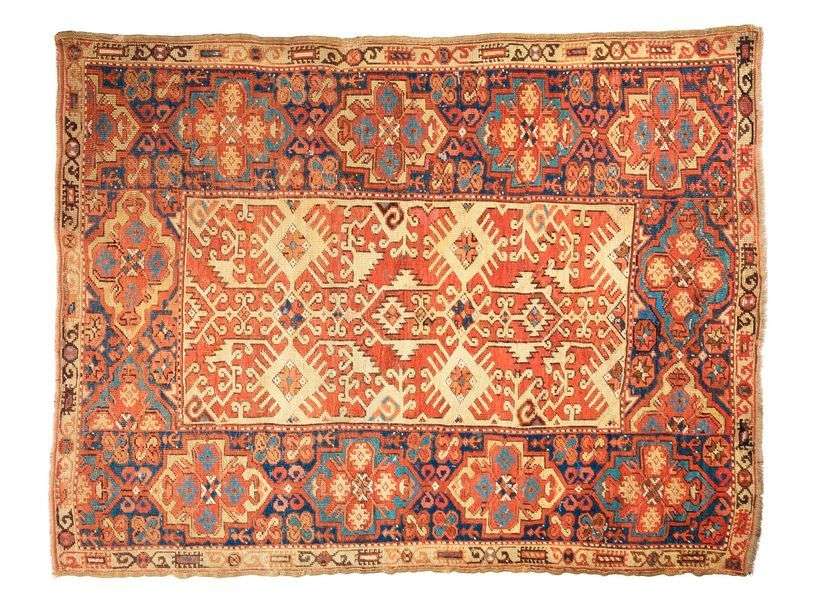 Un champ ivoire à treillage végétal brique stylisé, agrémenté de losanges étoilés à cœurs de diamants cruciformes et de petits crochets et volutes polychromes est entouré par une magnifique bordure bleutée, à semis de trèfles quadrilobés et de petites étoiles des Mèdes multicolores, où sont couchés des cartouches à croix étoilées, ornés de croix pattées, décorées de petits « Gühls » et traversées par des croix de saint André, le tout dans une magnifique polychromie. Petites contre bordure ivoire à guirlande de volutes, végétaux et insectes stylisés multicolores.