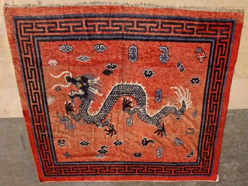 A décor de dragons à cinq griffes sur fond corail, bordure dite grecque