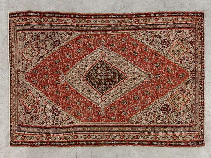 Caracteristiques techniques : velours, Chaines, trame et franges en Laine. Bon etat general. Champ brique a semis de petits caissons ivoire et Lilas en forme de diamants stylisés géométriquement . Contre Bordure beige a feuillages dentelles ' et calices stylisés. Bordure principale a semis de carapaces de tortues stylisées géométriquement en Polychromie. ~