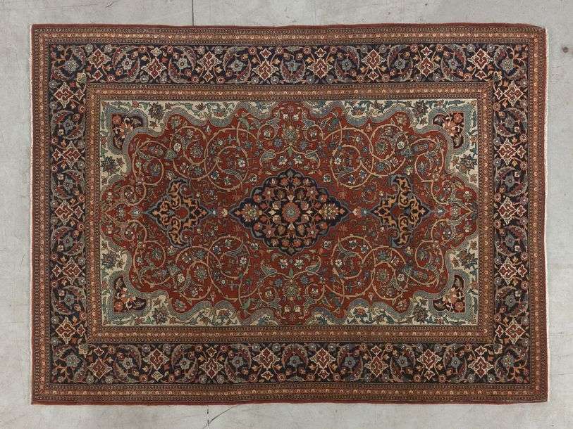 Caracteristiques techniques : velours en laine d agneau de Grande Qualite ∩, soyeuse , Fleurs entourees de Soie , Chaines, trame et franges en soie naturelle. Remarquable finesse : env 10/11000 n▄uds au dm2. Signature. Champ bleu ciel a rinceaux et guirlandes de fleurs encadrant une large rosace centrale florale a couronnes de fleurs stylisées beige et vieil or orné de deux palmettes. Quatre écoinçons rappelant le médaillon central. Bordure principale ivoire a semis de feuilles dentelles' entourees de palmettes de fleurs en forme de diamants stylisés. Piece Tres recherchée de qualite internationale. ~