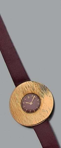 Modèle de dame en forme de disque en or 18K. Cadran bordeaux, aiguilles et index bâtons. Mouvement à remontage manuel. Boitier 2 corps.