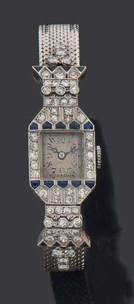 Modèle de dame joaillerie en platine et or blanc. Cadran argenté, chiffres arabes, aiguilles acier bleui. Boitier platine, la lunette est sertie de 2 rangées de saphir et de diamants ainsi que les attaches. Le bracelet est en or gris en maille tressée. Mouvement mécanique.