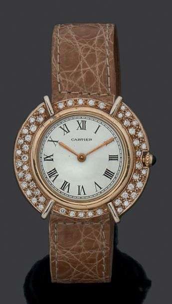 Cadran blanc chiffres romains aiguilles feuilles or. Lunette entourage diamants.