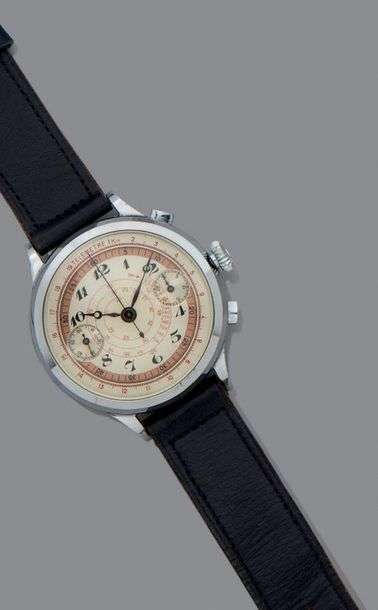 Chronographe suisse 2 compteurs. Vers 1940. Cadran argenté, chiffres arabes, aiguilles Breguet. Echelle télémètre et tachymètre. Mouvement base Landeron, freq 18000 Alt/h.
