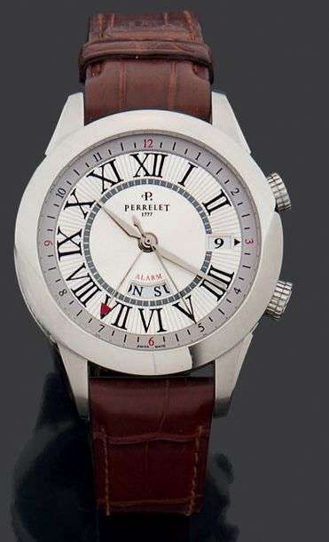 Alpha. Aiguilles date flèche. Guichet index alarm à 6h. Mouvement automatique, fond saphir transparent. Fonctionne, bon état. Ecrin et document d'origine.