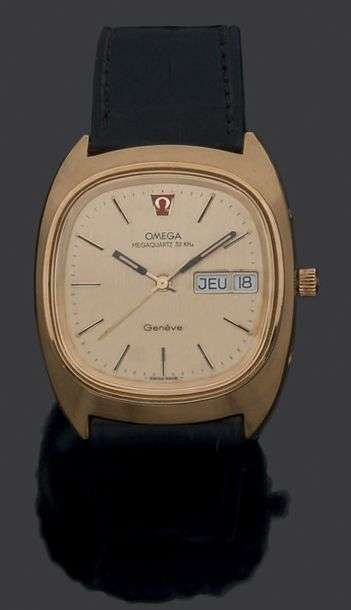 Rare modèle homme en plaqué or à quartz. Cadran champagne, index et aiguilles bâtons. Mouvement quartz.