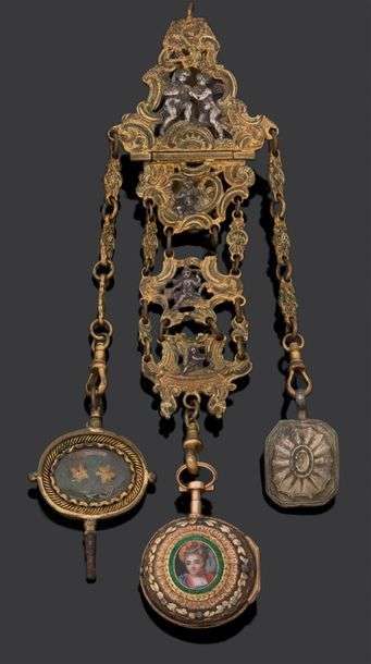 Grande Châtelaine en pomponne et sa montre de col en or 18K.