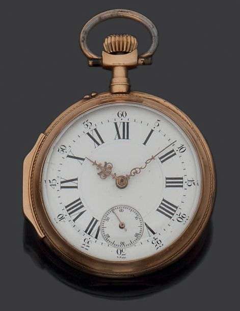 Cadran émail, chiffres romains, aiguilles de style. Mouvement échappement à ancre, freq 18000 alt/h. Fonctionne, bon état. Boitier 4 corps.