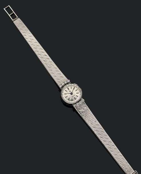 Montre joaillerie tour de bras tout or blanc 18K. Cadran argenté, aiguilles et index bâtons. Les attaches sont soulignées de 2 lignes de 4 de petits diamants. Mouvement mécanique.