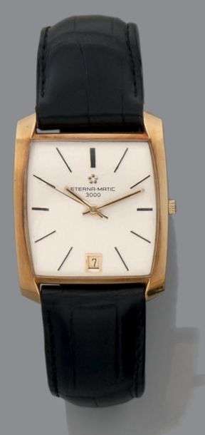 Modèle homme carré cintré automatique en or jaune 18K. Cadran argenté, index, aiguilles bâtons or.