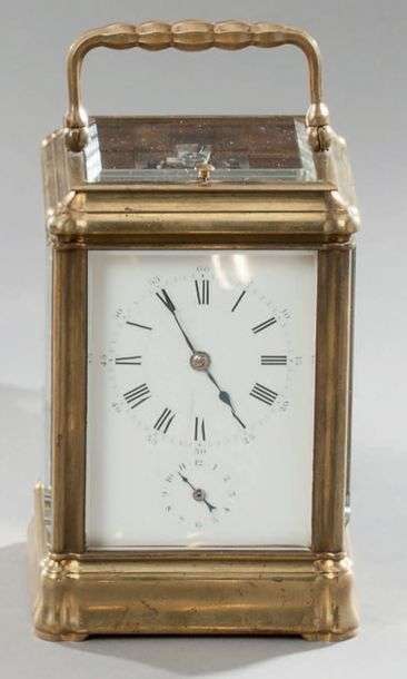 Pendule d'officier. Grande et petite sonnerie. Cadran émail chiffres romains, aiguilles feuilles. Cabinet 4 glaces, échappement à ancre.