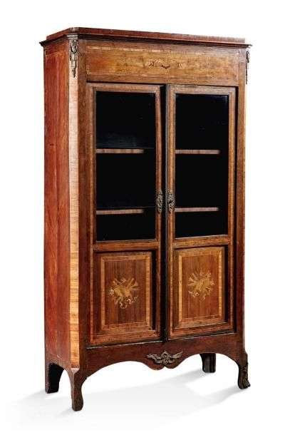 en bois de placage, à décor marqueté des attributs de la musique, ouvrant par deux portes vitrées.