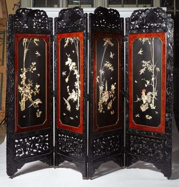 en bois noirci à décor floral ajouré. L'intérieur des panneaux en laque et incrustation d'ivoire, os et nacre à décor de volatiles dans des branchages