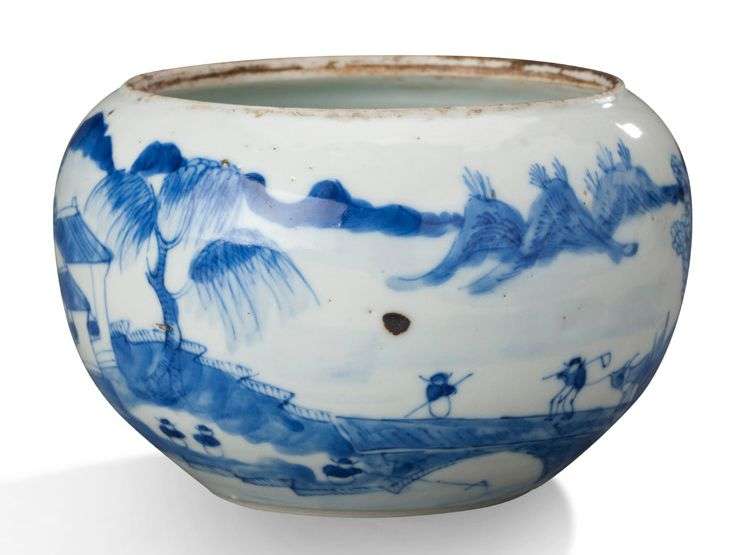 Partie inférieure sphérique d'un vase en porcelaine blanche, à décor sur le pourtour en bleu d'une cité lacustre animée de personnages, entouré de pics montagneux. (Manque la partie haute)