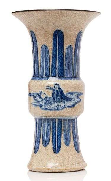 Vase Gu en porcelaine, à décor en bleu reposant sur un fond craquelé beige, d'immortels sur des nuages et feuilles de bananiers stylisés. Marque d'atelier sur la base.