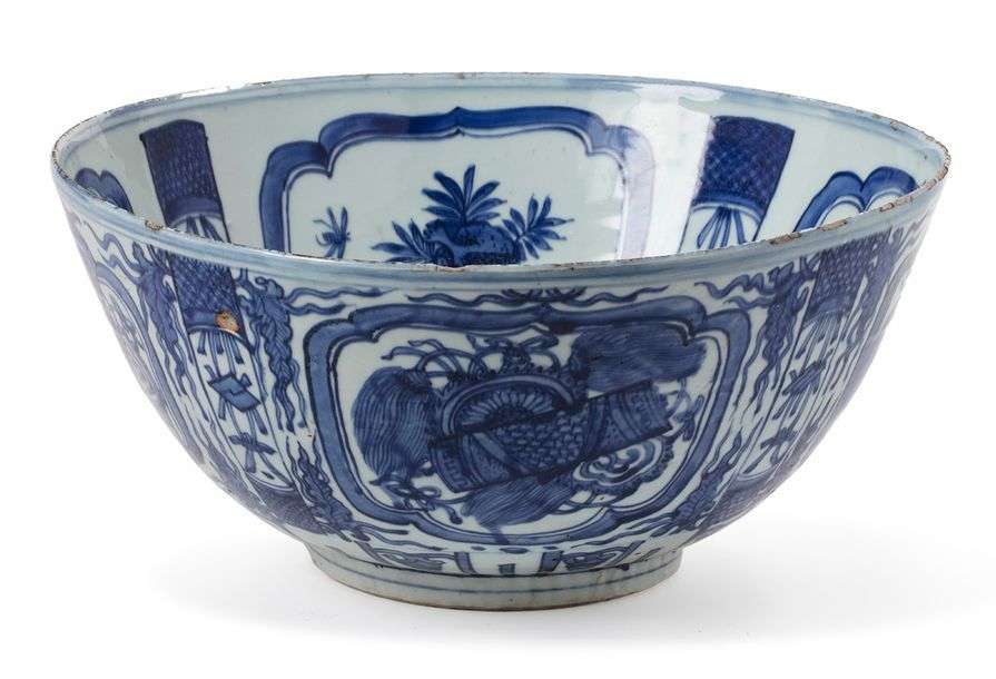 Importante coupe en porcelaine blanche, à décor interne et externe en bleu sous couverte de rouleaux de peintures et éléments de passementerie alternant avec des médaillons en forme de feuilles de lotus, contenant des coloquintes et grenades, des feuillages complétant le décor.
