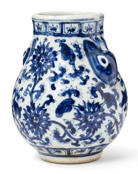 Petit vase de forme Hu, en porcelaine à décor en bleu sous couverte de fleurs et rinceaux de lotus. Les anses reprenant la forme de deux têtes de lapins.