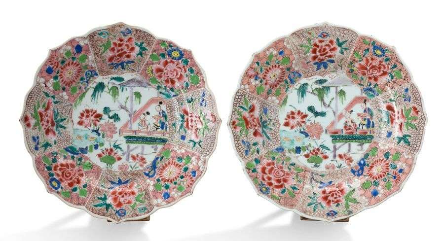 中国十八世纪初 粉彩莲瓣形仕女纹盘一对