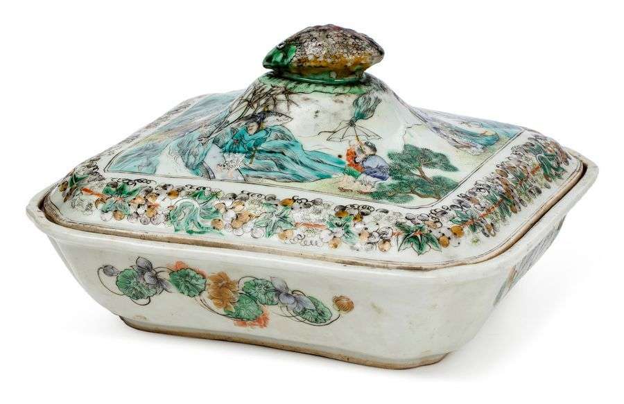 Terrine quadrangulaire couverte en porcelaine de Canton, à décor intérieur d'un récital de musique sur une terrasse, le couvercle orné d'une scène paysagée animée de personnages entourés d'une guirlande de fruits, un crapaud formant le fretel.