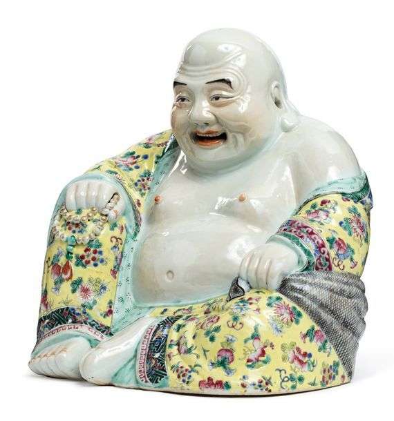Statuette en biscuit et émaux de la famille rose, représentant le Bouddhaï Milefo souriant, assis sur le sac des richesses et tenant le rosaire, la robe finement ornée de motifs de fleurs et végétaux. Marque de potier sur la base.
