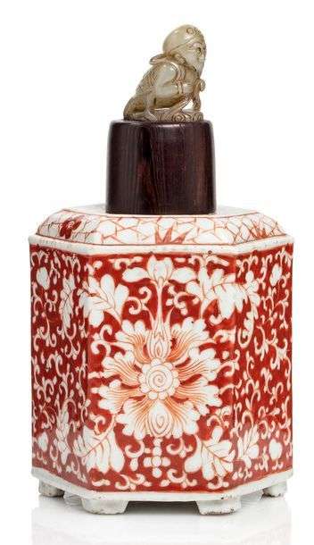 Pot à thé hexagonal en porcelaine et émail corail, à décor de fleurs de lotus et rinceaux feuillagés, le couvercle surmonté d'un Garuda en jade.