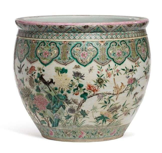 Grande vasque à poissons en porcelaine et émaux de la famille rose, à décor d'oiseaux évoluant parmi des pivoines, magnolias, la bordure supérieure ornée de têtes de ruyi en guirlandes.