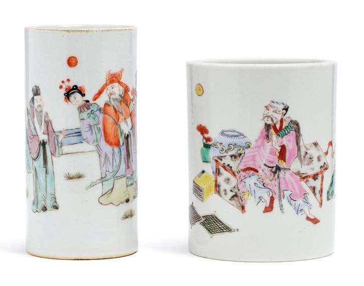 Lot de deux petits porte-pinceaux bitong en porcelaine et émaux de style famille rose, l'un à décor d'un philosophe observant une constellation, l'autre à décor de personnages, avec une marque apocryphe Guangxu.